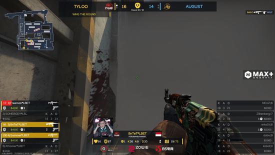 易边再战,拿下手枪局的august将比分追至9比9平,然而长枪局后TyLoo对香蕉道的前顶让蒙古队难以贴近,随后又依靠中路控制再次取得比分领先,15比10。虽然被蒙古的一个提速追回一分,然而TyLoo凭借小鬼的架点双杀随后又投掷物配合回防拿下比赛,16比11。