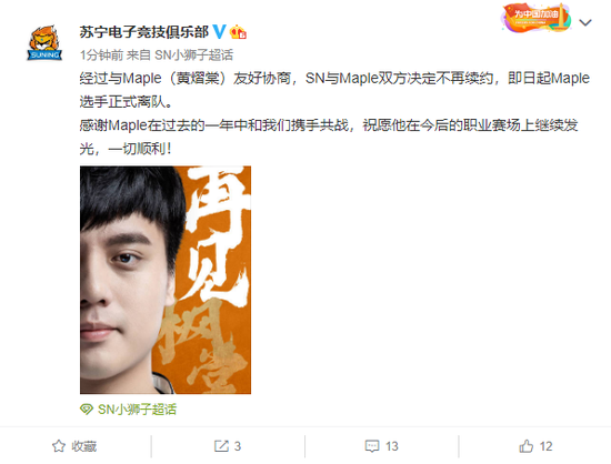 今天中午,苏宁电子竞技俱乐部发布公告,与Maple和平分手。