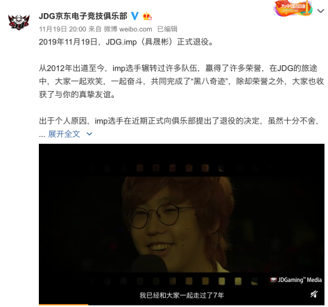 11月19日,根据JDG官方微博消息,imp(具晟彬)正式退役,曾经的世界第一ADC、鼠王imp选择断开链接,具晟彬将开启人生的下一段旅程。自2012年出道至今,从一位青涩稚嫩的电竞少年到久经战场的专业选手,imp用实力演绎着自己的高光生涯。