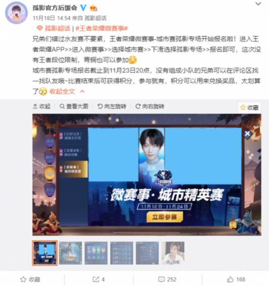 作为虎牙明星主播,孤影的实力不容小觑,露娜、雅典娜、王昭君、鲁班都被他打上过国服。此次城市精英赛,孤影可谓排面十足,打开王者荣耀游戏的公告栏就能看到孤影的海报,同时城市精英赛还设有孤影专场。城市赛与一般比赛相比有不少优势,除了能享受对战的乐趣,还可以通过收集积分兑换永远皮肤。