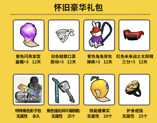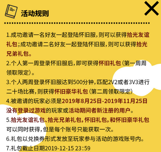 第一周登录怀旧服即可获得怀旧礼包,两周登录怀旧服达到500分钟,且怀旧服匹配2V2或者3V3进行20场比赛,则获得怀旧豪华礼包。被邀请的玩家必须是8.25-11.25没有登录过或者新注册的用户。