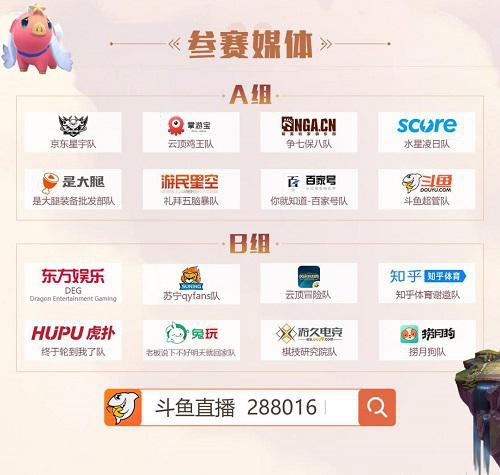 16个知名媒体各自组成的战队名也是各具特色,分别为:京东的京东星宇队、掌游宝的云顶鸡王队、NGA的争七保八队、score的水星凌白队、是大腿的是大腿装备批发部队、游民星空的礼拜五脑暴队、百家号的你就知道-百家号队,斗鱼的斗鱼超管队、东方娱乐的DEG队、苏宁的苏宁qyfans队、英雄联盟的云顶冒险队、知乎体育的知乎体育谢邀队、虎扑的终于轮到我了队、兔玩的老板说下不好明天就回家队、游久电竞的棋技研究院队,以及来自捞月狗的捞月狗队。