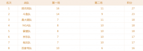 最终,捞月狗队以两局稳定的发挥积分排名第一,斗鱼队和是大腿队分别位列二三,NGA队、掌盟队、京东队、兔玩队以及百家号队也都成功跻身下一轮的比赛。同时,直播中队员和水友们的互动也非常愉快,看点多多。