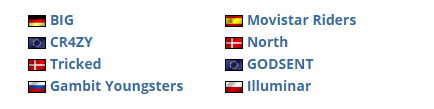 比赛共8支参赛战队,除了6支受邀战队之外,还有2支战队是通过欧洲和伊比利亚预选赛晋级的,分别是BIG和Movistar Riders。