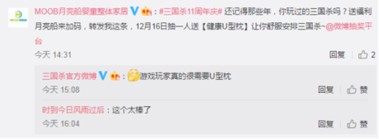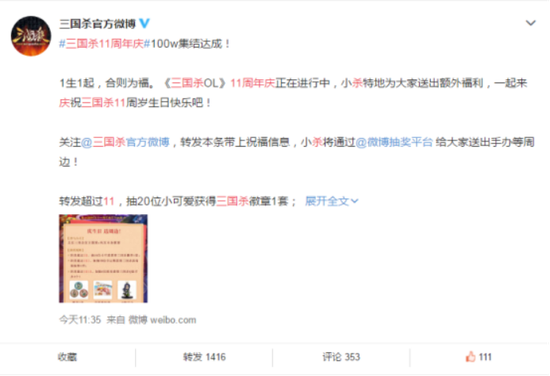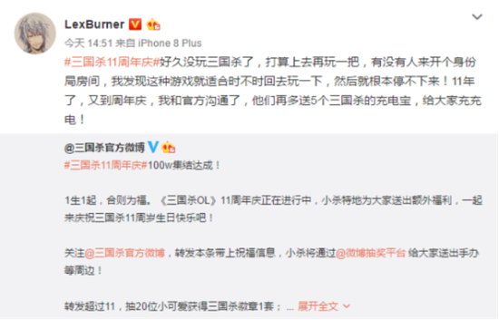 活动当天官方启动抽奖活动后,@电竞社、@LexBurner、@游戏投稿君等百万粉丝大V也来参与送祝福,充电宝、晴雨伞等带有三国杀标志的精美礼品投入放送中。同时,@江中猴菇、@中裕食品、@智恒快递柜等官方微博也纷纷转发加码,一起为三国杀庆生。截止目前,微博话题 #三国杀11周年庆# 阅读已超1200万,微博抽奖参与人数众多,活动异常火爆,奖品竞争也十分激烈。