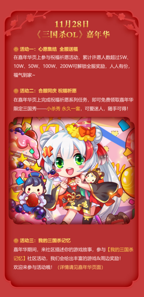 机不可失,失不再来,你还在犹豫什么?带上你对三国杀的喜爱和祝福,快来迎接属于你的嘉年华吧!