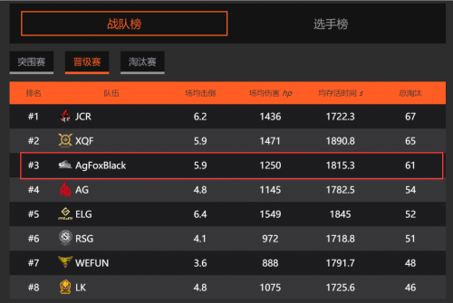 尽管在突围赛中表现并不突出,但在晋级赛段中,AgFox.Black的表现可以说是非常地抢眼。AgFox.Black一直被粉丝戏称为“猛男队”,枪刚人猛。在上周的晋级赛第一轮中,AgFox战队就以场均5.9个击倒,在30支参赛战队中位列第三,仅因总淘汰数少4个而排在XQF之后。