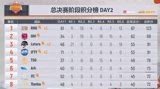 决赛圈时场上剩余四队12生存,QM、RNG满编,TSG三人,EDG仅剩一只独狼,此时马路同侧的QM和TSG率先交战,TSG击倒一人后又被雷倒一人,RNG趁机雷倒QM一人,EDG独狼Z9MAX被同侧的TSG发现收掉,随即暴露位置的TSG最后一人被QM带走,最终决战的RNG、QM相隔马路两侧展开扔雷大战,QM先后被雷倒两人,蓝圈最后收缩,最后一人选择不给分被蓝圈收掉。