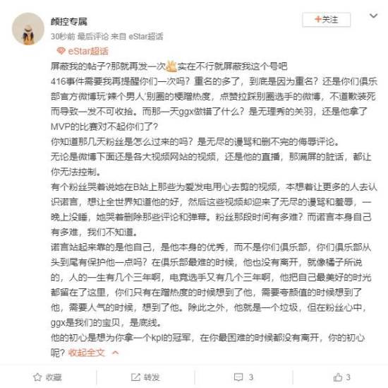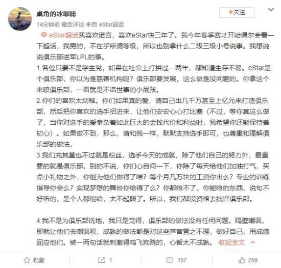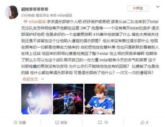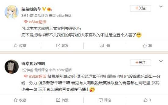 作为王者荣耀圈的人气战队,自然是一石激起千层浪。但就其微博超话中粉丝的反应来看,似乎KPL的粉丝并不希望eStar进军LPL。其中,也免不了提及416诺言ID事件(eStar王者荣耀分部队内选手诺言与LPL的EDG打野选手诺言重名)。也有粉丝认为,俱乐部花钱发展英雄联盟,势必导致在王者荣耀分部分心。