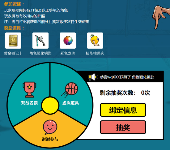 点击绑定信息,登录信息后即可获得一次抽奖的机会,活动期间内玩家可在游戏中进行ELO3v3的比赛,获得胜利可得到额外的抽奖次数,每个账号每天可以额外获得2次抽奖机会,比赛无大区限制。