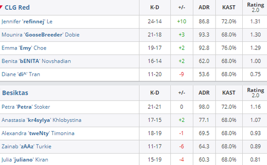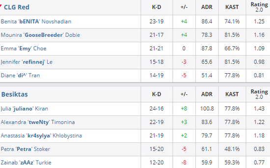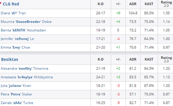 慢热的CLG Red在第二张地图上依旧失误频频,待对手遥遥领先后她们才在di^的爆发下回到自己的节奏。待对手气势正盛的反超比分后,Besiktas再想变阵非常规为时已晚。CLG Red最终一波铁板提速快攻,将比赛拖入图三。