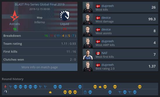 比赛进入下半场,液体确实有过一两波不错的反击。特别是在第21个回合,nitr0的三杀令人印象深刻。不过,Astralis在比赛的最后时刻还是挫败了液体的A点防守。阿杜的四杀让他们拿到赛点,比赛在几个回合后落下帷幕。16比11,Astralis获胜!