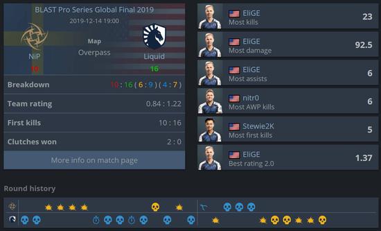 下半场,沉寂许久的老f0似乎找回了一些手感——赢下那个1v2的艰难残局后,NIP拿到了来之不易的一分。不过,就算NIP一度取得了分数上的领先,但液体随后就在A点组织起了坚固的防守。第24个回合,2K在警家方向用AWP连秒三人。第29个回合,NAF在拱门处搞定了反应稍慢的Lekr0,这波三杀让液体手握赛点。拿到赛点后的液体没有失误,比赛告一段落。