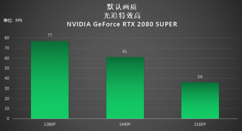 为了更好的展现性能与游戏体验,来看看以RTX 2080 SUPER为例,分别在三种不同分辨率下RTX光线追踪特效设置为最高画面下的平均帧数表现。在1080P分辨率帧数高达77帧,高出流畅标准60帧一截,能够满足畅玩的体验;2K分辨率下帧数达61帧,同样满足流畅运行的及格线;4K分辨率下画质所带来的压力进一步加大,帧数为36帧,建议4K分辨率下可开启DLSS选项或适当降低画质以达到流畅运行游戏的界限。