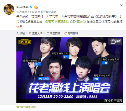 12月15日,花老湿在网易云首发了全新的和平精英直播推广曲——《欢迎来到这里》,这首歌是和国内知名乐队葡萄不愤怒合作完成的。葡萄不愤怒是国内新锐朋克乐队,不仅受邀参与了热门综艺《乐队的夏天》,更在娱乐圈收获了不少像乔欣这样的明星粉丝。此次合作录歌是一次大胆的尝试,同时也让粉丝们眼前一亮,没想到平时游戏技术极佳的花老湿在歌唱方面也是如此有天赋。网易云里不到1天更是收到了上千条评论,足见其受欢迎程度!