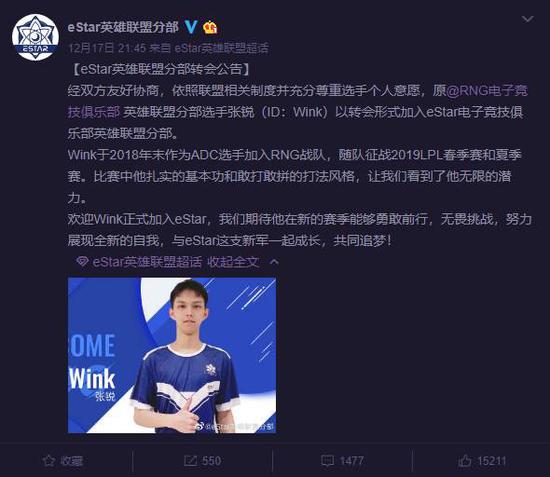 经双方友好协商,依照联盟相关制度并充分尊重选手个人意愿,原@RNG电子竞技俱乐部 英雄联盟分部选手张锐(ID:Wink)以转会形式加入eStar电子竞技俱乐部英雄联盟分部。