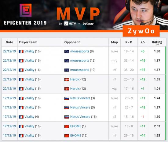 小组赛对阵EHOME和NaVi时,ZywOo就有着1.50+的rating。而在决赛时,ZywOo也凭借自己的发挥击败了ALEX和frozen,以1.58的rating傲视榜首。