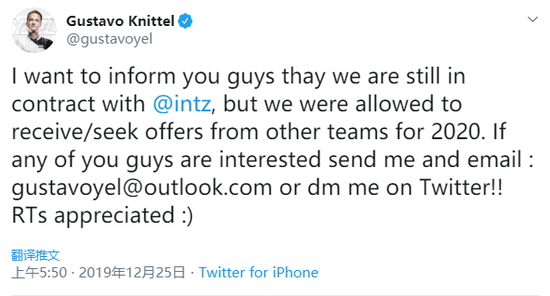 日前INTZ战队选手yeL在个人推特上表示:我想要通知大家,尽管我们还和INTZ有合同,但我们可以接收offer。如果有兴趣,请通过邮箱(gustavoyel@outlook.com)或者推特联系我。
