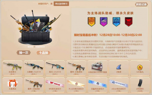 为了丰富CFPL赛事内容,并回馈电竞玩家及战队粉丝们,斗鱼还发起了主场福利活动,为斗鱼主场战队助威,即可领取永久皮肤。在活动时间12月28日10:00至12月30日22:00内,主场年度回馈抽奖限时开放,玩家于斗鱼直播间内每送出1支战队定制队旗,即可为战队助威并获得1次抽奖机会,点击抽奖即可抽取重磅好礼,不仅有机会领取炫金骑士、火麒麟、雷神等永久皮肤,更能抽取斗鱼定制cherry键盘外设等福利大奖。主场福利活动已经迎来了最后冲刺阶段,抓紧机会赢取豪礼。