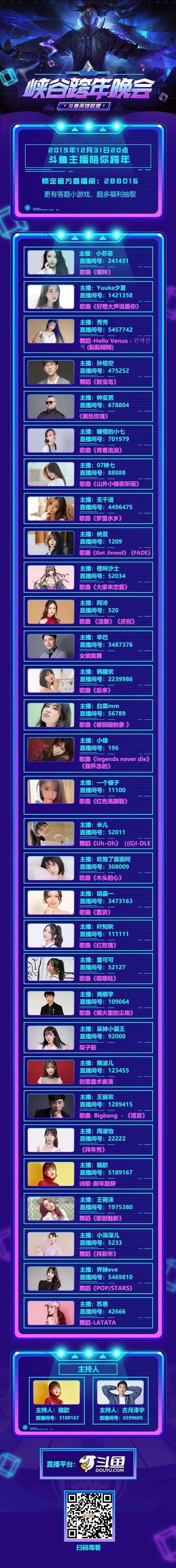 明天就是2020年新的一年元旦,今天作为2019年的最后一天,斗鱼直播平台别出心裁为各位召唤师准备了峡谷跨年晚会,阿冷、周淑怡、孙悟空、小苏菲、小缘、叶知秋、苏恩等众多斗鱼明星主播,将为大家带来一场精彩纷呈的视听盛宴。斗鱼英雄联盟分区陪你跨年,祝大家新年快乐!