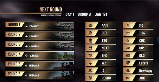 2020年1月1日,绝地求生虎牙天命杯小组赛首日A组的比赛正式打响。赛事地图为前三场为海岛图,第四场萨诺(小地图),第最后两场比赛为沙漠图。