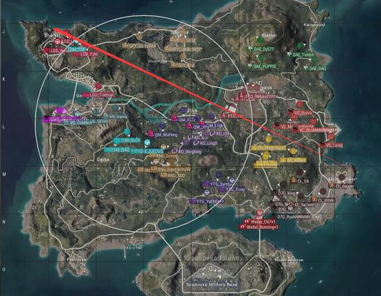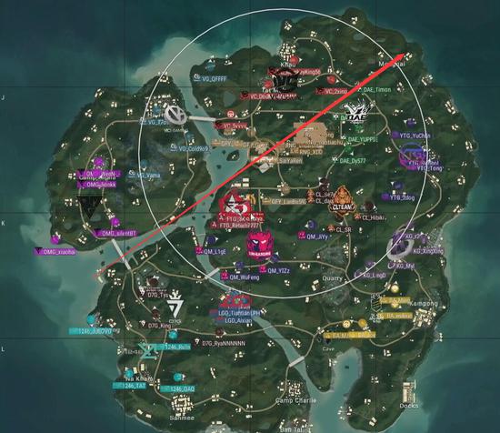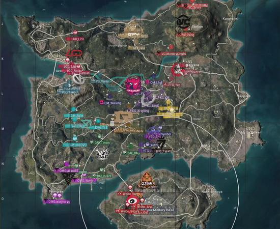 本局比赛采用海岛图,飞机从上往下,从S城右侧飞往机场岛,航线略偏右。QM去往R城,OMG去往渔村,D7G选择了农场及Mylta,安全区刷在了地图左侧,以遗迹为中心。
