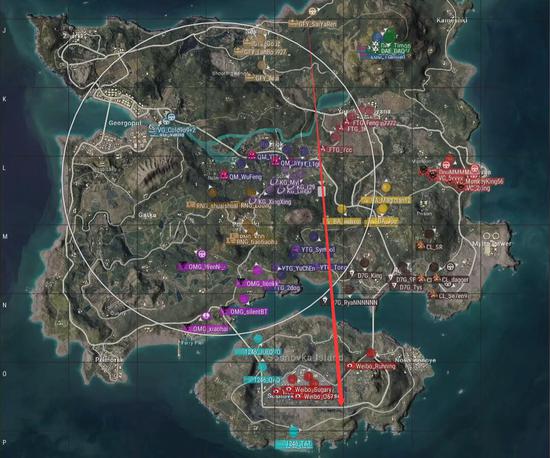 本局比赛采用海岛图,飞机从上往左下,从S城飞往机场岛左侧。Weibo去往机场岛,RNG去往P城,OMG选择了P港,安全区刷在了地图下方,是一个机场圈。
