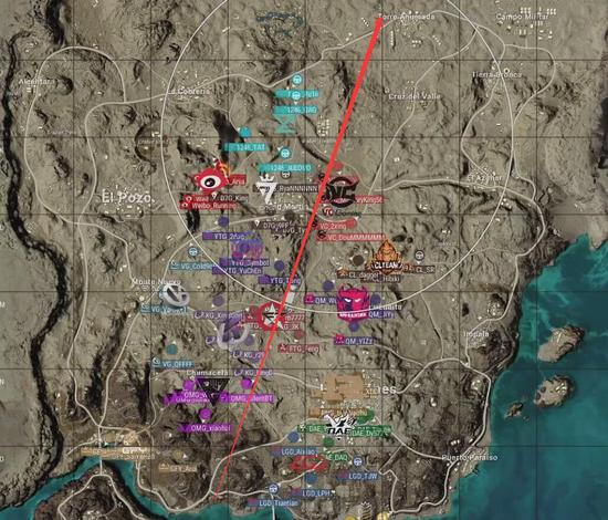 本局比赛采用沙漠图,飞机从下往上,航线偏右略显极端。FTG去往皮卡多,D7G去往圣马丁,RNG去往狮城,安全区刷在了地图上方,以圣马丁为中心。