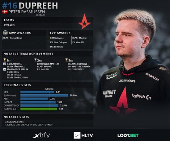 Astralis在2019年中取得的成绩离不开队内选手dupreeh的稳定发挥,这名丹麦选手也因此成为了2019 HLTV年度最佳选手第16名,也是他职业生涯第六次进入到TOP20榜单之中。