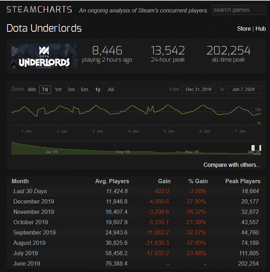 然而随着自走棋整个大类的热度消退,以及同类别其他竞争对手的多点开花,《刀塔霸业》这款游戏似乎也步上了A牌衰退的老路……根据Steam Charts的数据统计,《刀塔霸业》的巅峰玩家人数从2019年6月的20万锐减至12月的2万,且新年假期也没能有返潮抬头的态势。