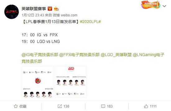 英雄联盟赛事发布微博,公布LPL春季赛首日首发名单。