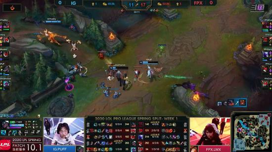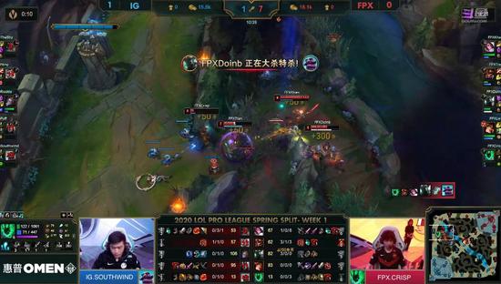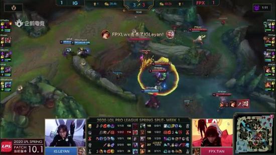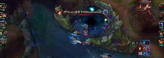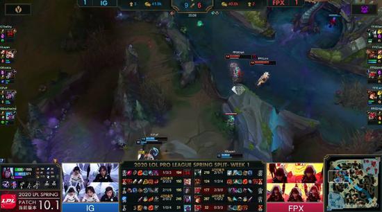 10分钟,FPX上野继续动手剑魔,完成击杀后IG支援姗姗来迟,却上演了葫芦娃救爷爷的剧情,锤石钩到奇亚娜,皇子接上大招进场。此时IG下路双人组前来输出却被剑姬直接将维鲁斯带走,铁男在正面无人能挡,FPX一波团战将IG打成了四人团灭。三分钟后,铁男和皇子动手剑魔,却被IG赶来支援反打,反身将FPX中野送回了泉水。