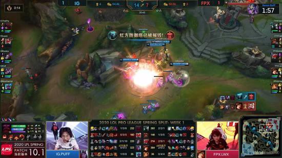 10分钟,IG集结峡谷先锋处,耗费了非常久的时间才拿下峡谷先锋,随后FPX捕捉到剑魔没有大招的细节,皇子动手兰博,瑞兹跟上输出,奥恩一手羊来打出关键控制,使得局势瞬间被FPX掌控。奥恩收掉残血兰博,女枪带走奇亚娜,随后FPX乘胜追击,IG下路双人组也遭到击杀。12分钟,皇子带着下路双人组动手剑魔,却被IG在剑魔的带领下吹响反攻号角,剑魔拿下双杀带走女枪日女,随后布隆也将皇子收掉。IG由此打出了一波零换三,将局势稍稍扳回。