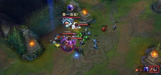 开局后4分钟,皇子来到上路包后冲塔动手剑魔,尽管剑魔先发制人但并没有用,最终剑姬拿下剑魔一血,与皇子携手残血逃之夭夭。6分钟,FPX展开了熟悉的中野联动,来到上路击杀剑魔,随后奇亚娜赶到配合防御塔的输出收掉皇子,但支援而来的发条也被铁男在塔下击杀。