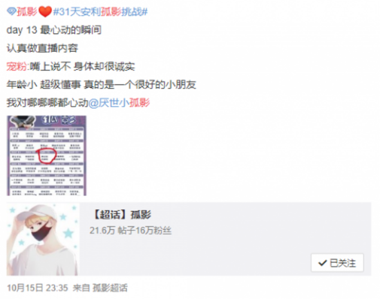 2019年10月份,孤影官方后援会举办了一个活动#31天安利孤影挑战#,活动阅读量接近2000万,在这里有粉丝眼中最真实的孤影。粉丝在微博分享孤影最让他们心动的时刻,有个粉丝说:“孤影年纪小,超级懂事,嘴上不说宠粉,身体却很诚实。”那么,孤影是怎么默默宠粉的呢?