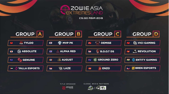 目前,分在A组的四支战队分别为中国赛区亚军战队TYLOO、澳洲代表队Genuine、日本冠军队Absolute、中东赛区亚军YaLLa;B组四支战队分别为韩国赛区冠军队MVP.PK、东南亚赛区季军队LaZe、泰国赛区冠军队Alpha.Red、蒙古赛区冠军队AUGUST;C组首轮撕杀将在澳洲战队Ground Zero、新加坡战队BOOT、土耳其战队Demise和中国香港战队ENZO之间展开;D组则包括中国赛区冠军队VG、越南队GTV.Revolution、印度战队Entity和菲律宾战队Bren。