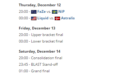 BLAST 全球总决赛将于12月12-14日打响,地点为巴林Riffa的ISA城市体育中心。比赛共四支参赛队伍,来自于BLAST联赛积分最高的四支战队:Astralis、Liquid、FaZe和NIP。