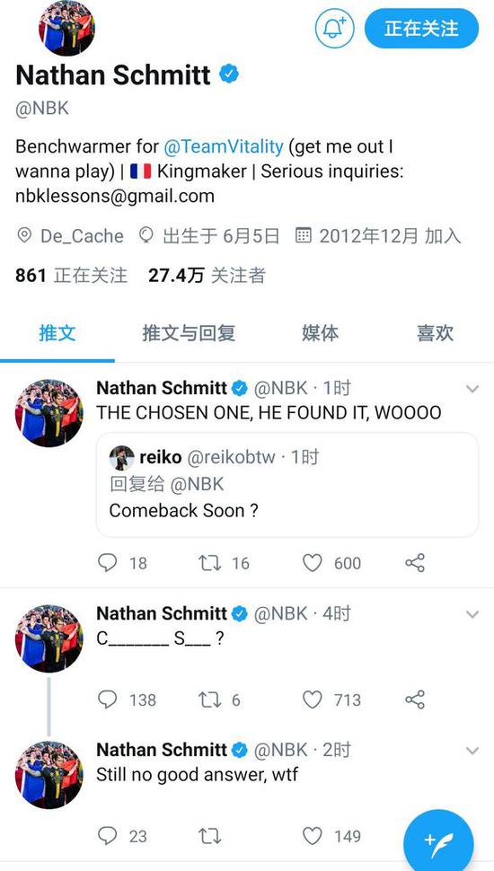 日前法国知名选手NBK-在个人推特回应粉丝的问题时表示自己不日将重返赛场。
