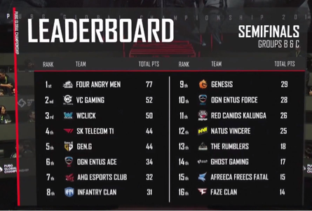 几乎与小组赛同样的剧情,半决赛首日三支PCL战队整体低迷,一时间国内论坛风声鹤唳。但毕竟小组赛叱咤风云的4AM还未出场,国内观众都在期待他们能够在半决赛上再现神勇发挥。果不其然,他们用近乎无解的发挥豪取77分和单日两鸡,用提前锁定决赛名额的成绩向世界证明PCL赛区。在4AM的带领下,iFTY和VC也接连打出气势,用一次次强势吃鸡向世界证明,本日战罢4AM和VC确定晋级,iFTY则遗憾告别世界赛。
