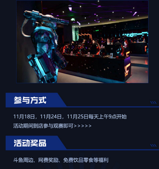 本次斗鱼的线下观赛活动联合了网鱼网咖与全游电竞两大合作伙伴共同展开,将斗鱼的线下观赛活动举办到了全国九大城市,在武汉、上海、昆明、天津等城市共设立了十个观赛点。除了在11月18日开放外,还将会在PGC总决赛举办期间的11月24、25日继续为玩家开放。
