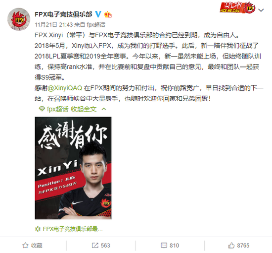 感谢@XinyiQAQ 在FPX期间的努力和付出,祝你前路宽广,早日找到合适的下一站,在召唤师峡谷中大显身手,也随时欢迎你回家和兄弟团聚!