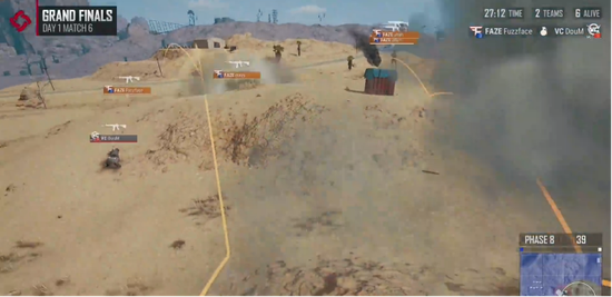 在最后的一场的较量中,FAZE战队迎来自己的高光时刻。虽然在初期,FAZE战队的优势并不明显,地理位置也有一定的劣势。但是凭借着果断的抉择和强悍的正面作战能力,FAZE战队一步一步稳扎稳打挺进决赛圈,建立起自己的优势。其中,FAZE战队手雷的使用炉火纯青,多次在关键对决中使用手雷成功击倒对手,打开进攻的突破口。最终,拥有人数和架枪双重优势的FAZE战队选择直接正面前压淘汰VC战队,取得比赛的胜利。