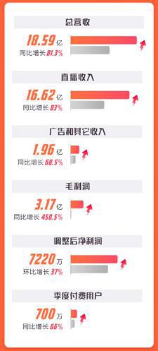 斗鱼于北京时间11月27日发布了2019年第三季度财报。数据显示,斗鱼Q3总营收为18.59亿元,较2018年同期增长81.3%;非美国通用会计准则下录得净利润7220万元,较第二季度环比增长37%,继续实现盈利;毛利润同比增长450.5%,达到3.17亿元,毛利润率17%,经营效率显著提升。用户规模方面,斗鱼季度平均MAU达到 1.64亿,其中移动端MAU达到5210万。付费用户达到700万,同比增长66%,继续以绝对优势领跑游戏直播行业。