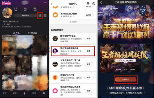 王者荣耀的玩家们注意啦!由腾讯微视打造的“王者视频周战报”目前已经正式开放预约,用最酷炫的姿势分享精彩战绩,一键预约便可轻松get!首先打开腾讯微视客户端,然后点击“我”右上角的“任务中心”,下滑并在品牌合作任务中选择“预约王者视频周战报”,跳转后点击“立即预约”并“授权”,现在授权成功即可于11月30日在腾讯微视客户端查收您的首份王者视频周战报了,近期错过预约的小伙伴也莫慌,只要在授权预约后最多再经历一周的等待,也是可以收到“王者视频周战报”的。