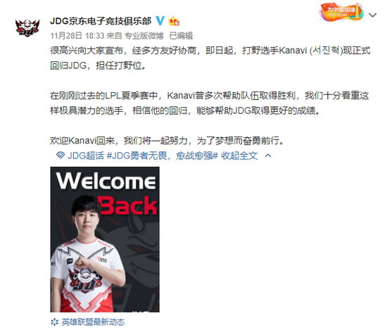 很高兴向大家宣布,经多方友好协商,即日起,原GRF打野选手Kanavi (서진혁)现正式加入JDG,担任打野位。