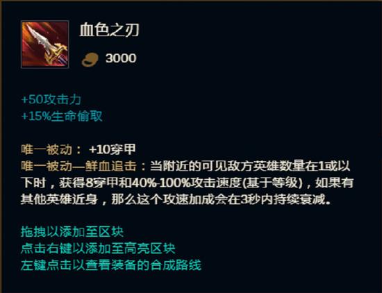 这里着重说下新增的血色之刃,首先这个装备是典型的单带型装备。在英雄正常视野范围中没有敌方英雄时,可以提供穿甲以及大量的攻速,但是一旦有英雄靠近身边,穿甲与攻速效果会在3秒内快速衰减,也就是说想要拥有被动属性就不能被人近身,而近身的范围就是英雄的常规视野范围,所以不要为了对线而第一件出血色之刃,因为对线时双方一定都在互相的正常视野范围内,被动的穿甲以及攻速效果是一直不能触发的,所以说这个装备只有在单带或者游走时才会体现出最大的效果。
