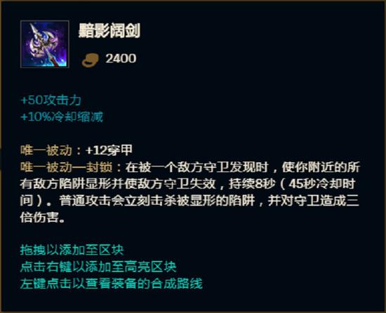 移除了幕刃的侦查守卫眼属性,并转移到了黯影阔剑上,新装备黯影阔剑属于性价比比较高的穿甲装备,提供50攻击力和10%冷却缩短,虽然穿甲属性只有12点,但是因为2400块低廉的价格比较适合第一件做出,快速到达一个成装的节点,而血色之刃则是偏向带线类装备,在持续1V1的对线时无法发挥全部属性。