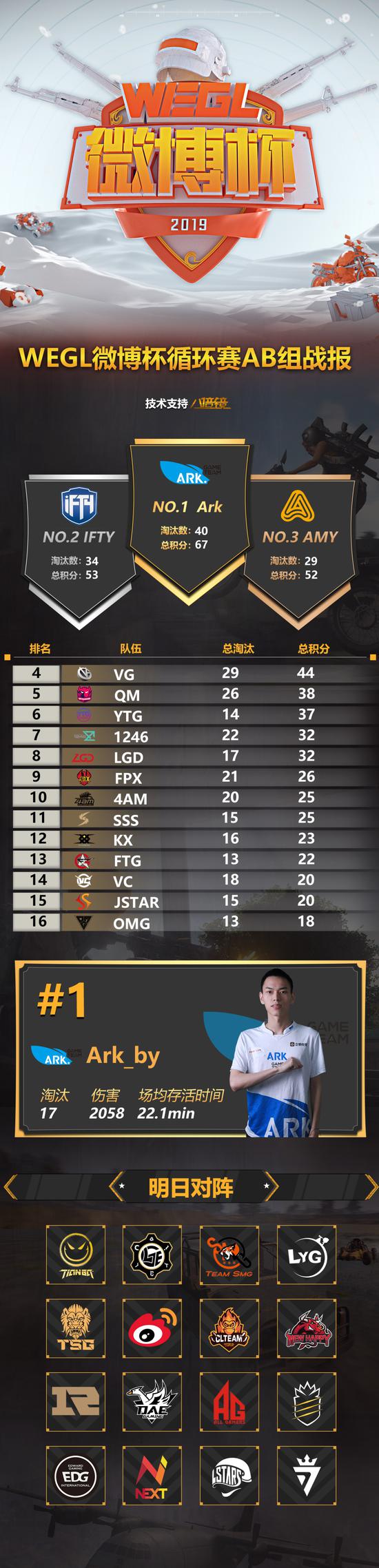 AB组比赛落幕,赛后长图随后出炉,Ark吃到两鸡以67分领跑积分榜,by选手发挥出色,以17个淘汰成为今日TOP1!