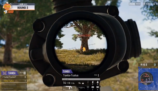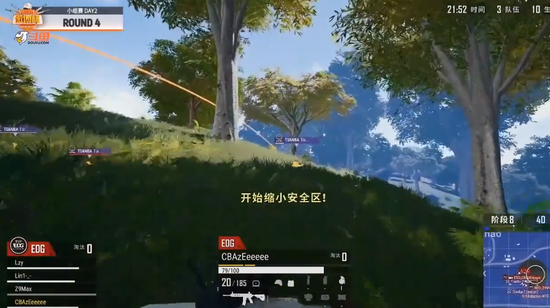 决赛圈来到伐木场东侧,此时场上3队伍10生存,蓝圈收缩,BA和天霸在进圈过程中两队battle互有击倒,此时EDG抓住机会前来收割,在蓝圈和EDG的夹击下两队被淘汰,最终EDG坐收渔翁之利成功吃鸡!
