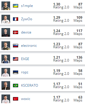 目前Top1选手中竞争激烈的是三人:s1mple、ZywOo和device。不过从大赛数据上看,device稍逊一筹,rating数据只有1.24,而s1mple则有1.30,ZywOo有1.29。